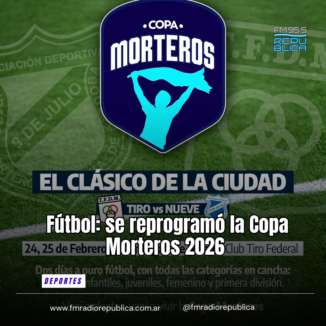 11/02/2026 - Como ocurre habitualmente en el receso de verano, los equipos de nuestra ciudad juegan la Copa Ciudad de Morteros en todas las categorías. En esta edición 2026 se realizará en Tiro Federal el sábado 21 y domingo 22 de febrero. El sábado se disputarán los partidos de divisiones inferiores masculinas, mientras que el domingo por la mañana jugarán todas las categorías del fútbol femenino. Continuará a las 18:00 con la Reserva, a las 20:00 se disputará el encuentro de Veteranos y a las 21:00 Primera División.