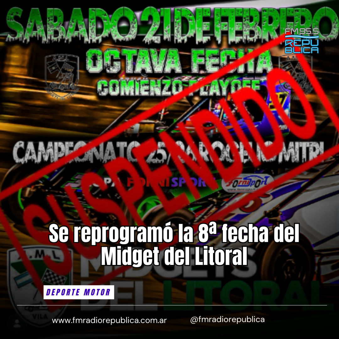 19/02/2026 - “Debido a la cantidad de agua caída hasta el momento y la que se espera, nos vemos en la obligación de suspender la 8va fecha prevista para el 21 de febrero. Dicha fecha será reprogramada para el próximo sábado 28 febrero siempre y cuando acompañe el clima”, comunicaron desde la organización del Midget del Litoral. El 28 se correrá la primera fecha del Play Off. En la actual temporada se reprogramaron varias fechas por las condiciones climáticas.