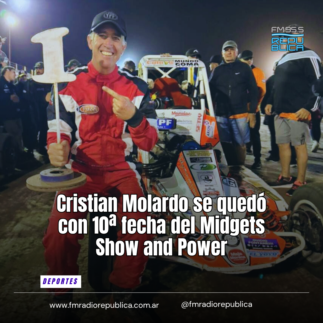12/10/2025 - Este sábado, en una jornada cambiante, que se inició con una temperatura elevada y finalizó con un fuerte viento sur que hizo descender bruscamente la temperatura, el morterense Cristian Molardo hizo valer su experiencia para quedarse con la victoria en una entretenida 10ª fecha del Midgets Show and Power. Las variables climáticas le pusieron un manto de incertidumbre al sábado, pero felizmente pudo llevarse a cabo íntegramente el cronograma y se logró sacar adelante esta antepenúltima fecha en el circuito de San Antonio.