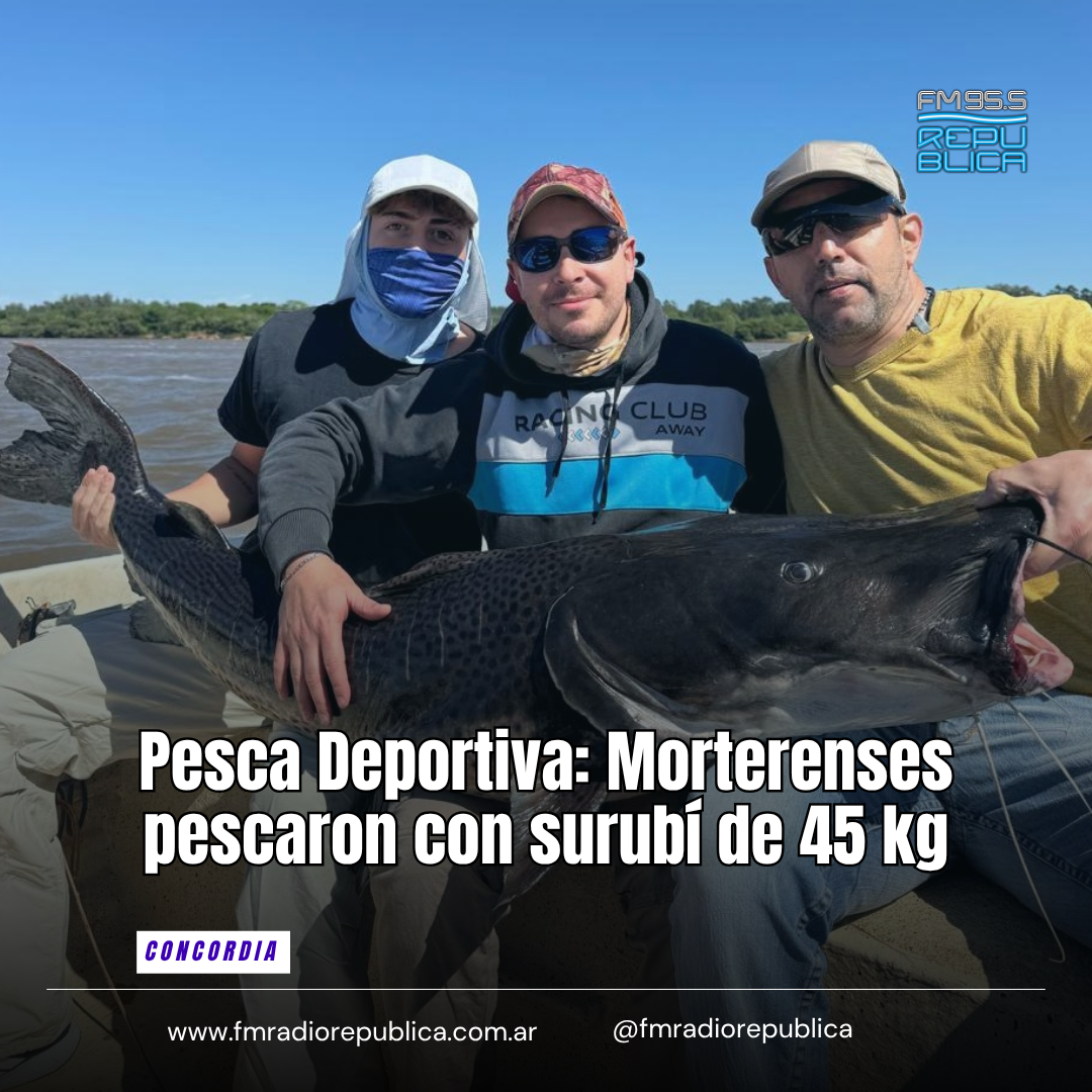 11/11/2025 - En el mes de octubre, tres morterenses estuvieron realizando pesca deportiva en la ciudad de Concordia, Entre Ríos, sobre el río Uruguay. “Lo que hacemos nosotros es pesca deportiva, se captura, se saca un par de fotitos rápido y devolución automática al río. Tuvimos la suerte de lograr una captura de un surubí de una coloración rara, extraña, muy oscura, un negro intenso te diría”. “Pesaba aproximadamente 45 kg, kilo más o menos”, destacó Daniel Arce.