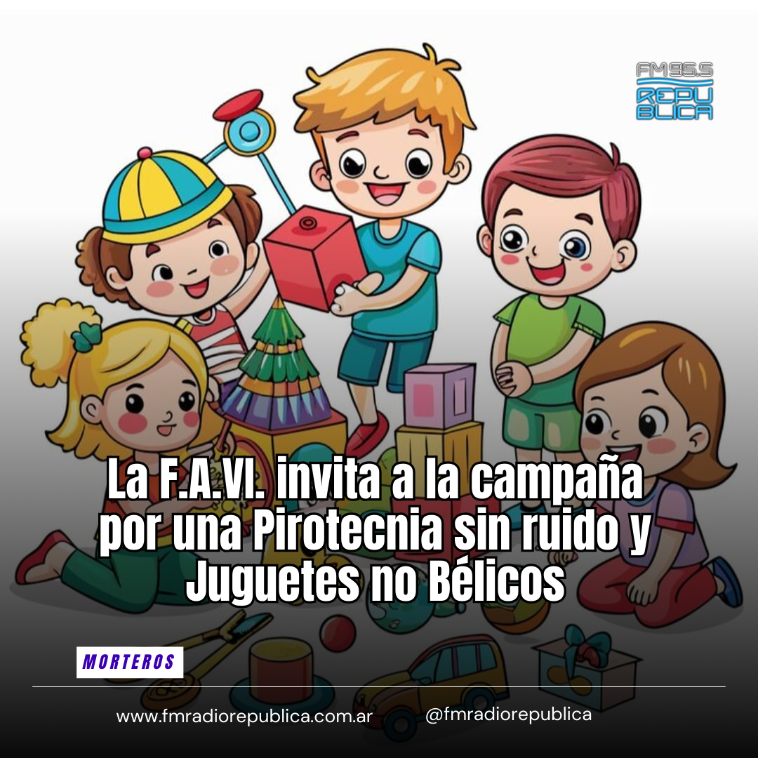22/12/2025 - “Al igual que la campaña por una pirotecnia sin ruido, la Fundación Amigos de la Vida te invita a que adhieras a la campaña del juguete no bélico, regalándole a los niños juguetes NO violentos”. “Ellos merecen tener un futuro mejor y nosotros podemos ayudar a construirlo”. “Gracias por ser los artífices de ese futuro, de ese mundo soñado y también gracias por participar”, expresaron desde la F.A.VI.
