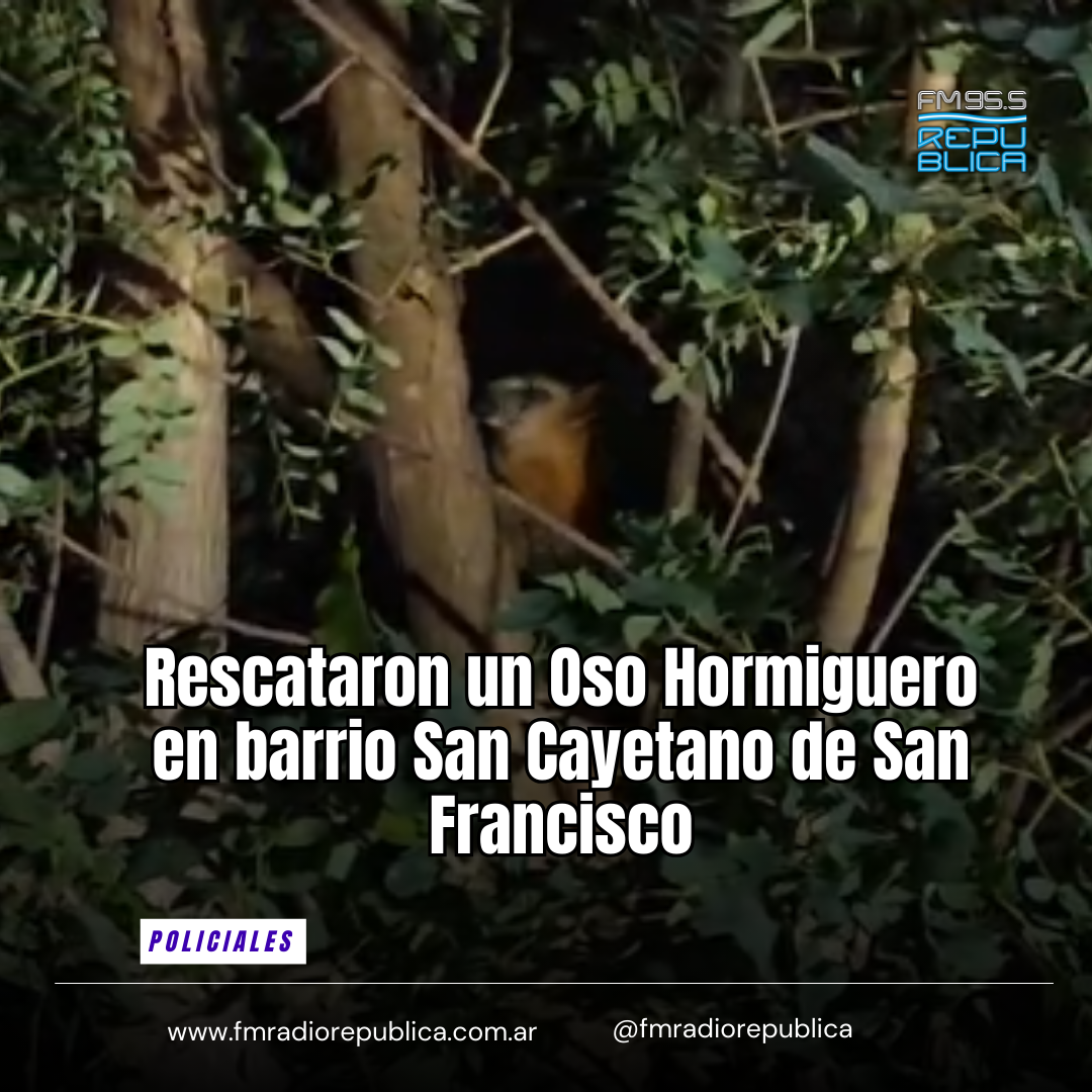 06/02/2026 - Este jueves, en horas de la noche. a través de un llamado a la línea de emergencias 911, se tomó conocimiento de la presencia de un oso hormiguero sobre un árbol, en inmediaciones de Av. Rosario de Santa Fe, frente a Veneranda de Barrio San Cayetano de la ciudad de San Francisco. Tras varios intentos, y ya en horas de la noche, el animal descendió por sus propios medios, logrando el personal de Guardafauna colocar al mismo al resguardo en una jaula, con las medidas de seguridad correspondientes, para su posterior traslado y protección.