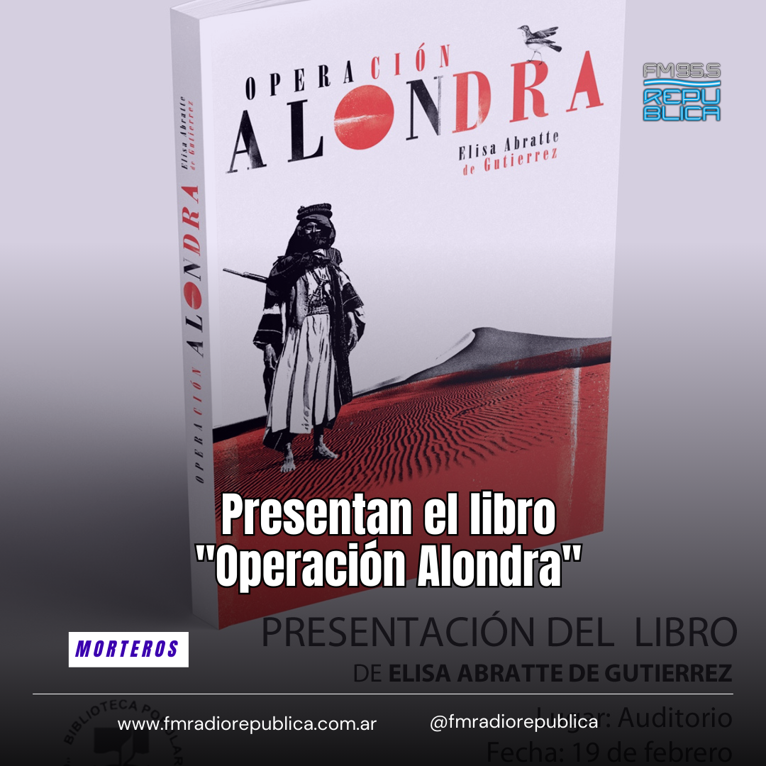 05/02/2026 - El miércoles 19 de febrero se realizará la presentación del libro Operación Alondra, primera obra publicada de la escritora morterense Elisa C. “Pety” Abratte. Será en el auditorio de la Biblioteca Popular Cultura y Progreso a las 20:30 horas, con entrada libre y gratuita. Operación Alondra es una novela ambientada en África que combina aventura, tradición y búsqueda interior, abordando temas como la libertad, la identidad y la fuerza del espíritu humano.