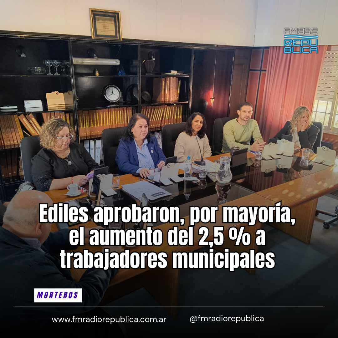 12/12/2025 - Este viernes, en el Concejo Deliberante de la ciudad de Morteros, quedó aprobado por mayoría que los trabajadores municipales de nuestra ciudad reciban, a partir de diciembre una cifra no remunerativa del 2,5%, al igual que en febrero del 2026. A partir de esto, se generó un intenso y respetuoso debate entre ediles de la oposición y el oficialismo. Fue aprobado por mayoría.