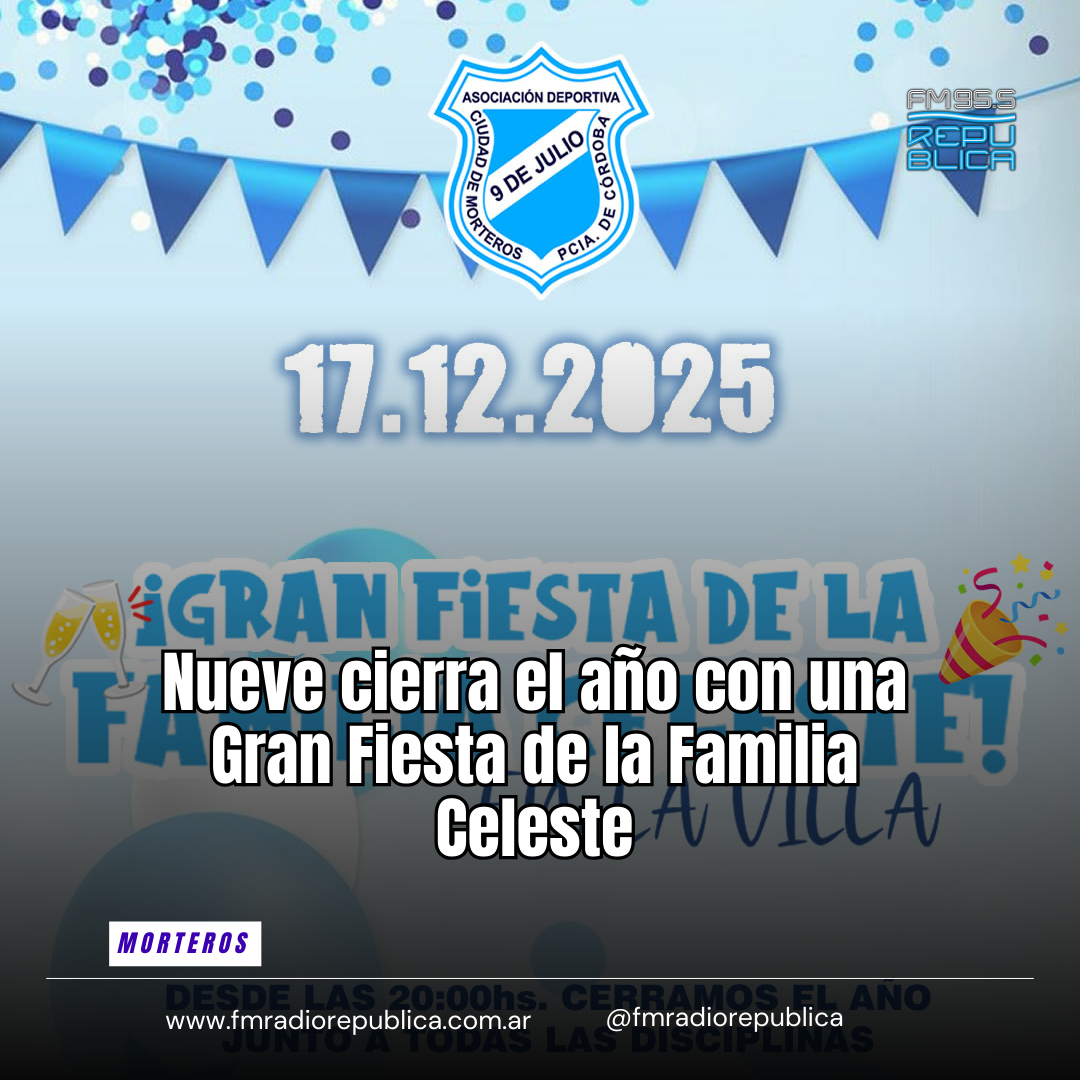 12/12/2025 - El Club 9 de Julio de Morteros organiza un cierre de año con todas sus disciplinas. El evento se llevará a cabo en La Villa el próximo 17 de diciembre desde las 20:00 hs. Desde la organización resaltaron que la entrada será gratuita para todas las familias que deseen acompañar a los deportistas. Además, podrán llevar sillones y conservadoras. Habrá servicio de buffet, juegos y música en vivo.