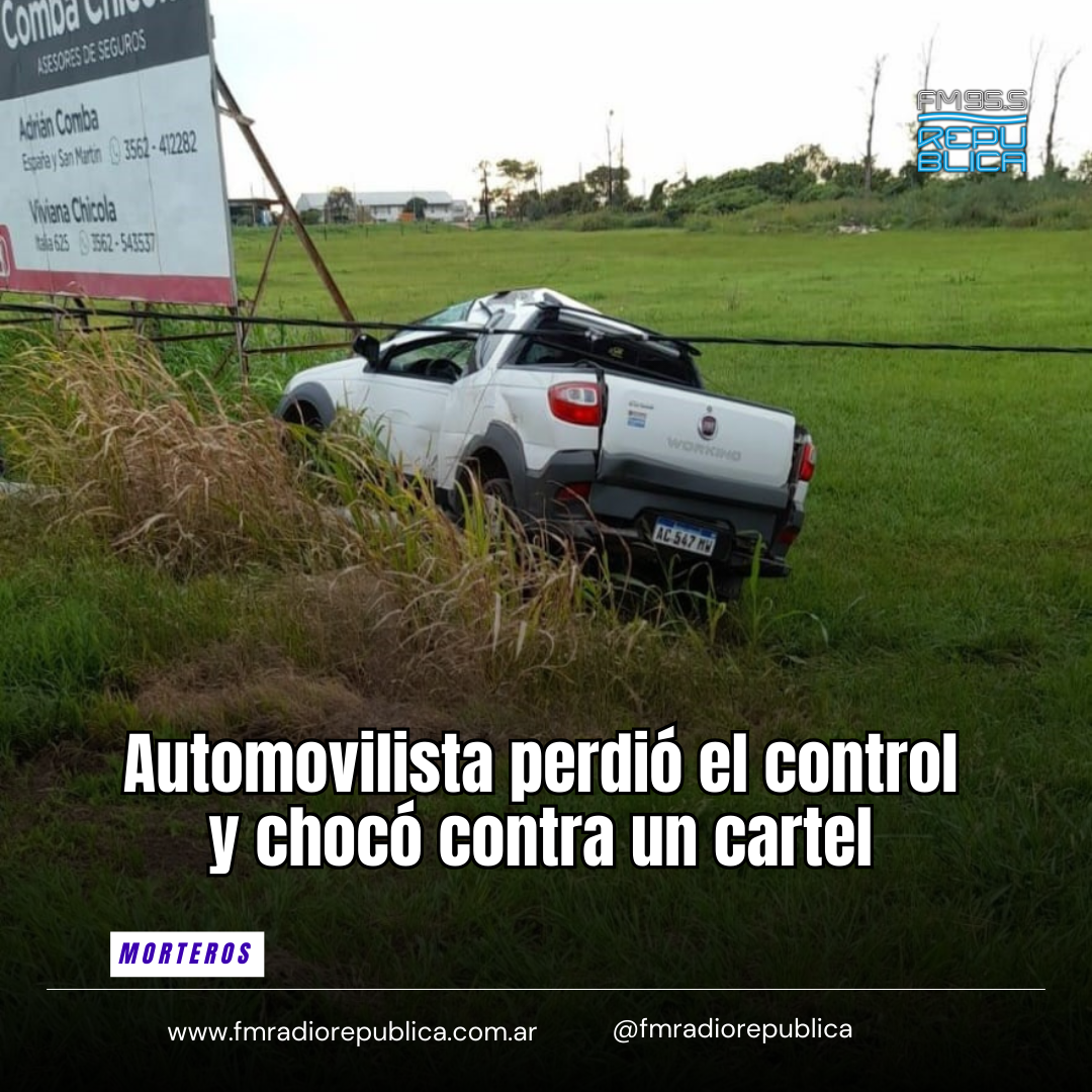 25/12/2025 - En la mañana de este jueves (7:50 hs) se produjo un accidente en el acceso norte a Morteros. Según informaron desde Seguridad Ciudadana, el conductor de una camioneta Fiat Strada perdió el control del rodado e impactó contra un cartel ubicado en la banquina. El conductor resultó con lesiones leves. Trabajaron en el lugar personal policial, seguridad ciudadana y Servicio de Emergencias