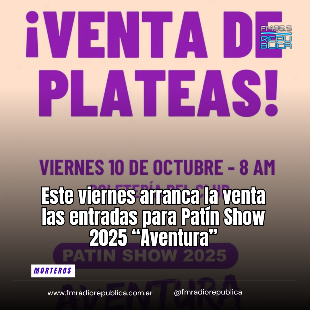09/10/2025 - Este viernes salen a la venta las entradas para el espectáculo de Patín Show 2025 “Aventura”, cuya presentación será el viernes 14 y domingo 16 de noviembre. Las entradas se venderán desde el viernes a las 8, continuando el lunes y miércoles desde las 20 hs en boletería del club. También pueden adquirirse contactando a Corina Prino, “Kamuchi” Dellagiovanna o con cualquiera de las patinadoras. El valor de la entrada arranca desde $15.000.