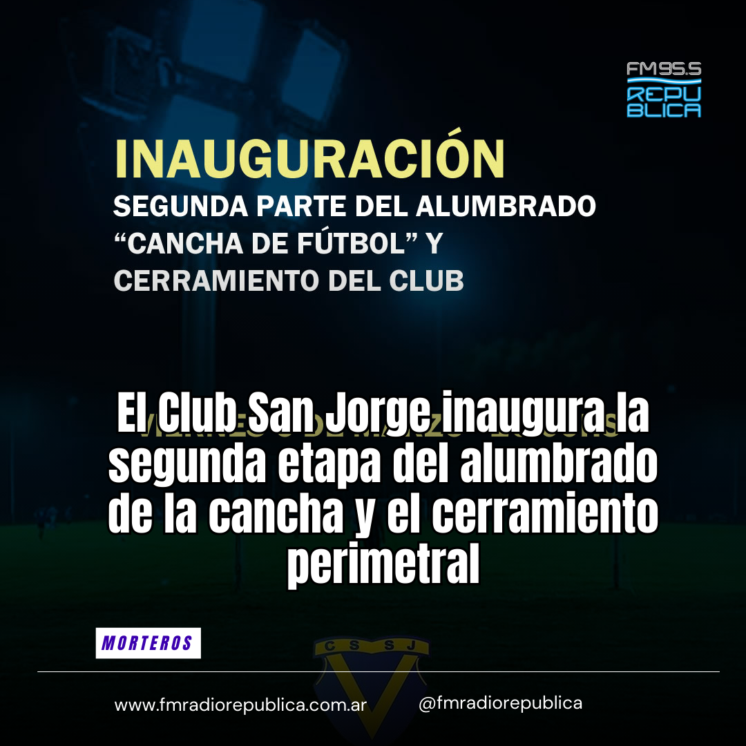 02/03/2026 - El Club San Jorge de Morteros llevará adelante la inauguración de la segunda parte del alumbrado de su cancha de fútbol y el cerramiento perimetral del club, una obra clave para el fortalecimiento de su infraestructura deportiva. El acto se realizará el viernes 6 de marzo, a las 20:00, en la sede de la institución, ubicada en la ciudad de Morteros. La actividad contará con la presencia de autoridades, socios, deportistas y miembros de la comunidad.