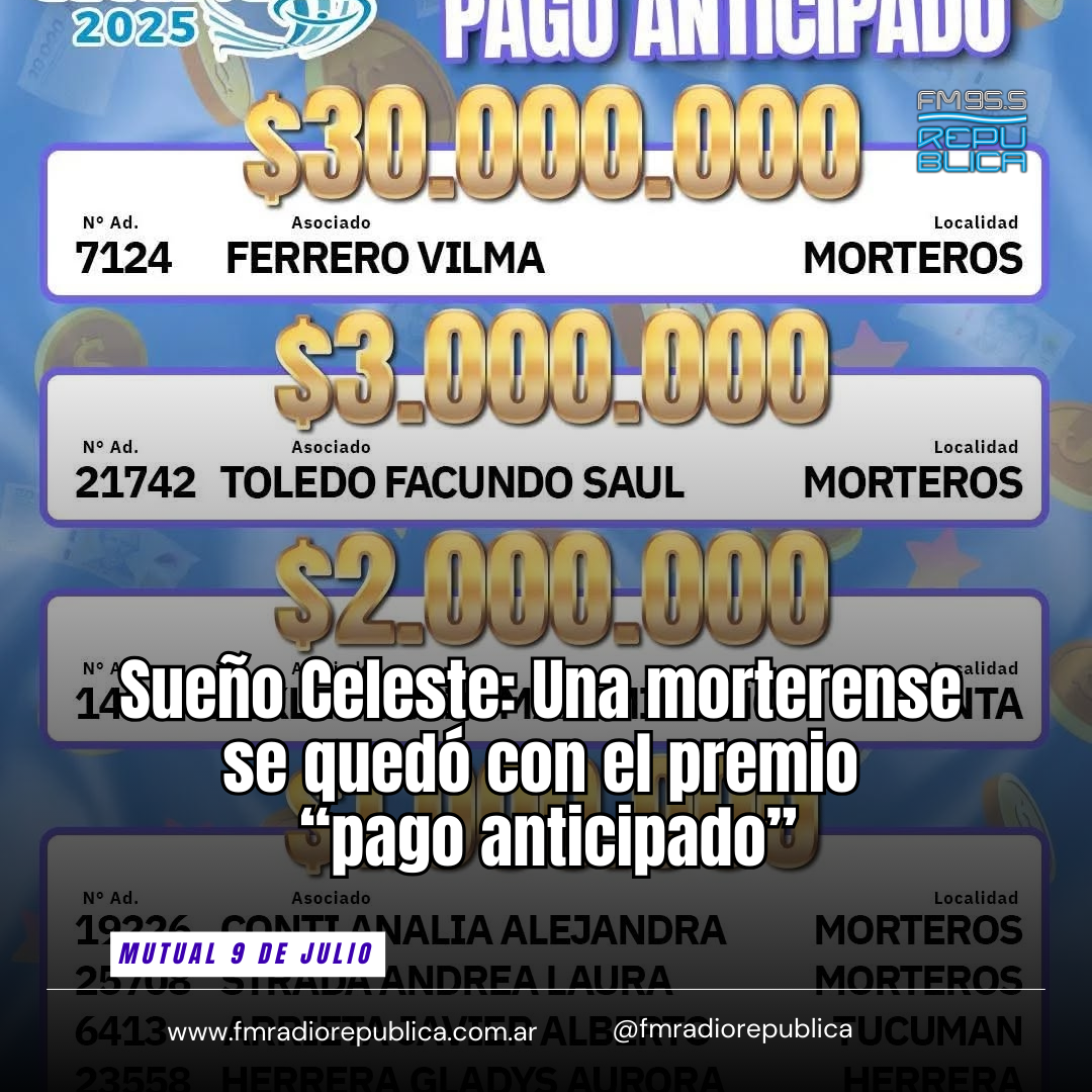19/09/2025 - El jueves se concretó el sorteo mensual y “pago Anticipado” y de la promoción “Sueño Celeste 2025” de Mutual 9 de Julio de Morteros. El Pago Anticipado contó con cinco premios de 1 millón de pesos, uno de 2 millones, otro de 3 millones, y el más importante de 30 millones que se lo llevó Vilma Ferrero de Morteros. Por su parte, Facundo Toledo, también de Morteros, se alzó con un premio de 3 millones y Julio Mikleg de Sacanta ganó 2 millones de pesos.