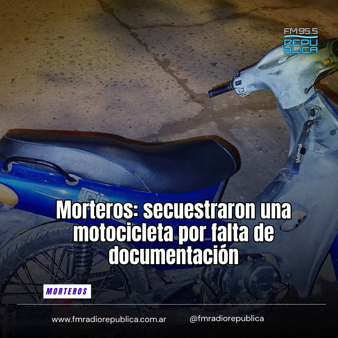 17/02/2026 - En la madrugada de este martes, personal policial de nuestra ciudad controló una motocicleta Guerrero Trip 110 c.c., color azul, que circulaba sin dominio colocado en Eva Perón esquina Italia. Se identificó al conductor, un masculino de 16 años, quien estaba acompañado por otro masculino de la misma edad, ambos oriundos de Morteros. Los jóvenes carecían de la documentación correspondiente del rodado, constatándose además la falta de dominio visible.