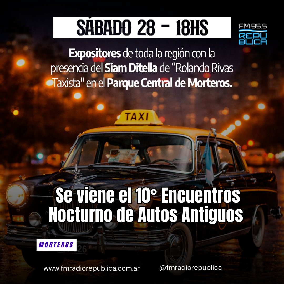 13/02/2026 - El viernes 27 y sábado 28 de febrero se realizará en la ciudad de Morteros el 10° Encuentros Nocturno de Autos Antiguos. El viernes 27 se realizará la Cena show con agasajo a Heriberto Pronello. Habrá homenajes, expositores y grandes clásicos como el Siam Di Tella de la reconocida novela Ricardo Rivas Taxista. La exposición se realizará el sábado 28 en el Parque Central de la ciudad.