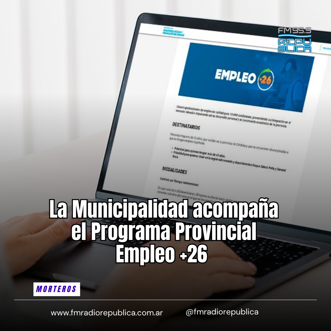 26/09/2025 - La Municipalidad de Morteros informa que acompaña y promueve en nuestra ciudad el programa Empleo +26, impulsado por el Ministerio de Desarrollo Social y Promoción del Empleo de la Provincia de Córdoba. Este programa está dirigido a personas mayores de 26 años, sin empleo formal o desocupadas, que residan en la provincia. Consiste en un entrenamiento laboral de 20 horas semanales durante seis meses en empresas del sector privado, con instancias de capacitación específicas y talleres certificados a través del Campus Córdoba.