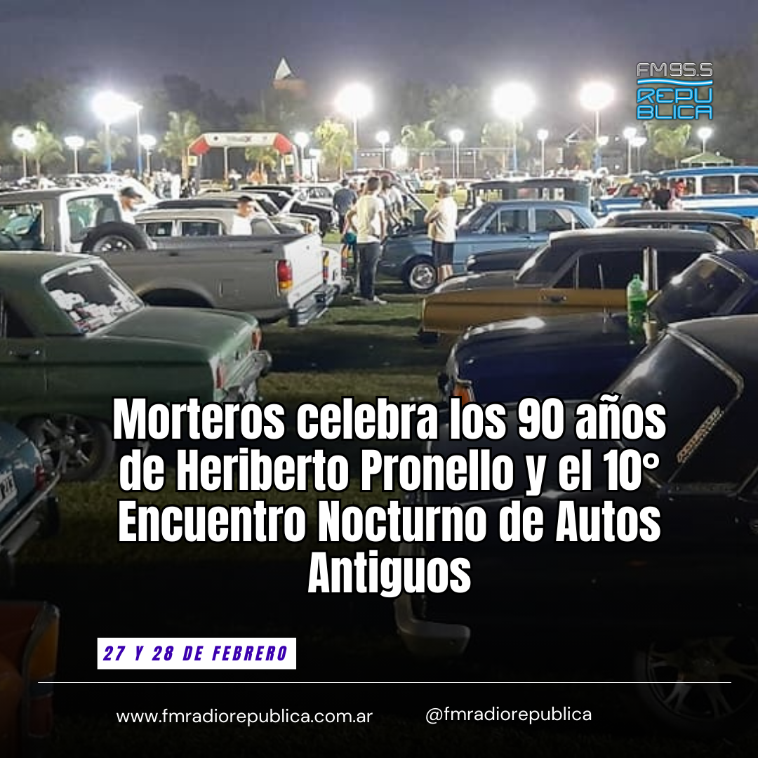 24/02/2026 - La ciudad de Morteros vivirá un fin de semana especial los días 27 y 28 de febrero, con una propuesta que combinará homenaje, historia y pasión por el automovilismo. En el marco de su 90° aniversario, se reconocerá la trayectoria de Heriberto Pronello, una de las figuras más destacadas del diseño automotriz argentino, y se desarrollará la 10° edición del Encuentro Nocturno de Autos Antiguos en el Parque Central. La celebración comenzará el viernes, a las 20:30, en el Salón de Eventos de la Asociación Deportiva Nueve de Julio.