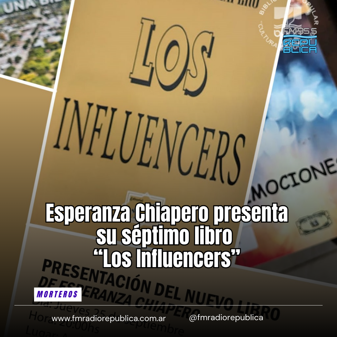 24/09/2025 - La escritora morterense Esperanza Chiapero presentará su nuevo libro “Los Influencers” el jueves 25 de septiembre a las 20:00 hs, en el Auditorio de la Biblioteca Popular “Cultura y Progreso”. Se trata de la séptima obra de la autora, en la que aborda con profundidad las razones y el trasfondo del conflicto en Medio Oriente, con especial foco en el territorio de Israel. La actividad es abierta a todo público y con entrada libre y gratuita.
