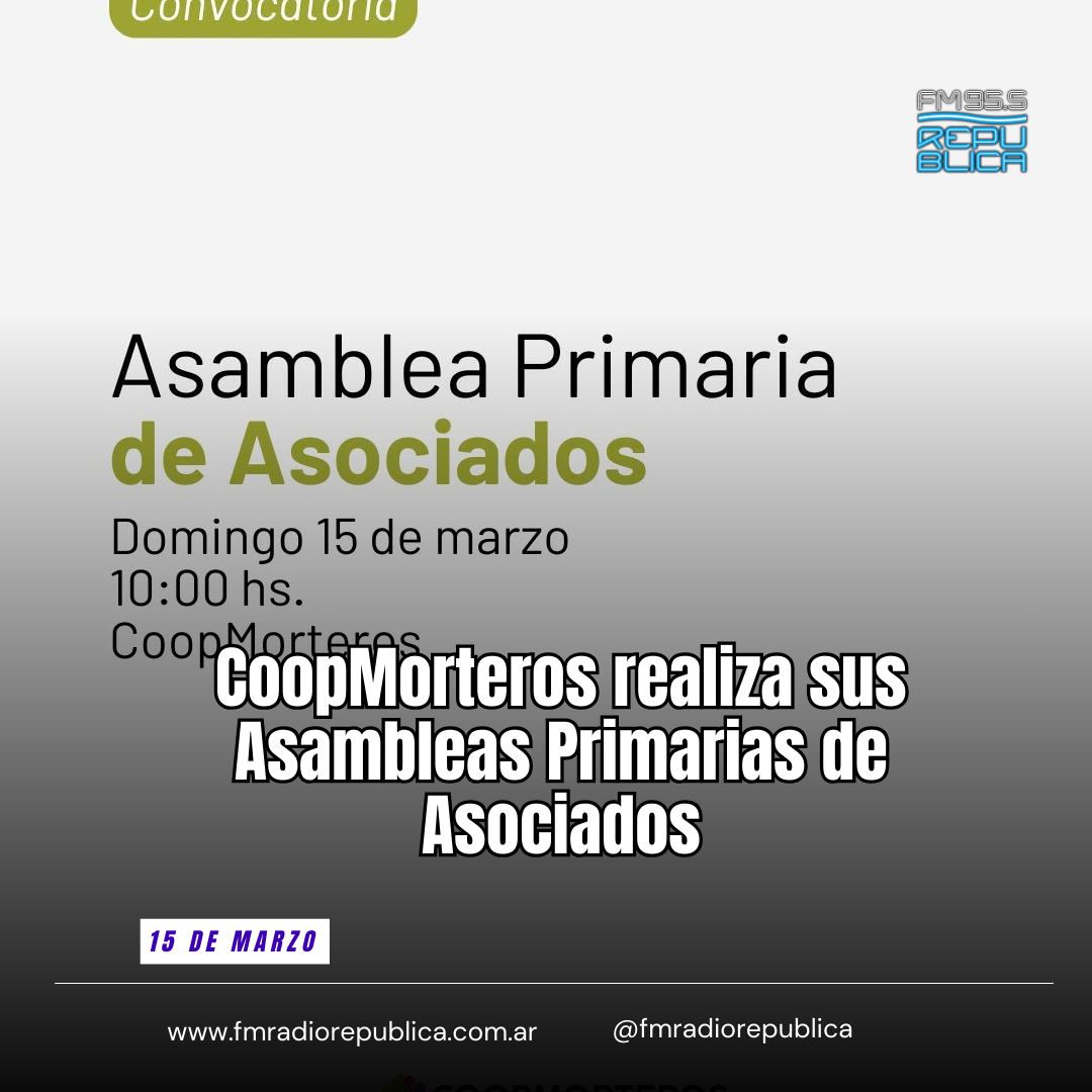 13/03/2026 - Cooperativa de Servicios Públicos de Morteros Limitada convoca oficialmente a sus Asambleas Primarias de Asociados, que se realizarán el próximo 15 de marzo de 2026, a partir de las 10:00 y hasta las 18:00. La convocatoria se realiza conforme a lo establecido en el Estatuto Social y contempla la división de los asociados en cinco distritos, según la inicial de sus apellidos.