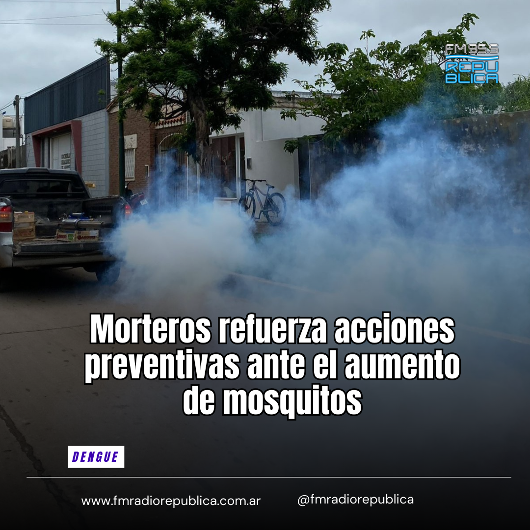 23/02/2026 - La Municipalidad de Morteros informa a la comunidad que, ante el incremento de la población de mosquitos registrado en los últimos días, se intensifican las acciones de prevención y control en distintos sectores de la ciudad. El mosquito Aedes aegypti, transmisor del dengue, se encuentra activo en nuestra región. Por este motivo, resulta fundamental sostener y reforzar las medidas de cuidado en cada hogar para evitar la proliferación de criaderos y reducir el riesgo de contagio.