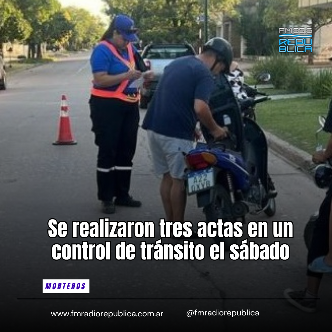 23/03/2026 - El pasado sábado, a las 18:00, en la ciudad de Morteros se realizó un control de tránsito en la intersección de calle San Martín y Bv. 9 de Julio, participaron del mismo la Policía de nuestra ciudad, el S.E.O.M e inspectores de tránsito. Se controlaron unas 30 motocicleta, se realizaron 3 actas (dos licencias vencidas y una sin portar el casco correspondiente). A las 18:40 se levantó control.