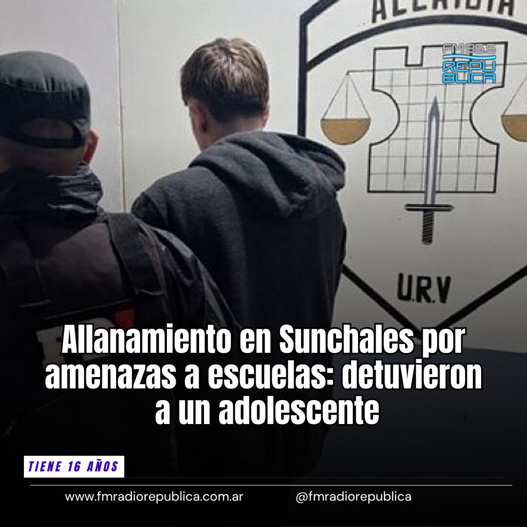 06/04/2026 - En medio de un clima de preocupación creciente en la región, un adolescente de 16 años fue detenido en Sunchales tras una investigación por amenazas difundidas en redes sociales contra instituciones educativas de la zona. En diálogo con Radio República la periodista Mónica Scaglia de Sunchales Día por Día explicó que la situación comenzó días atrás luego del estremecedor ataque en la escuela Mariano Moreno de San Cristóbal, donde un alumno de 15 años mató a otro chico de 13 con una escopeta.