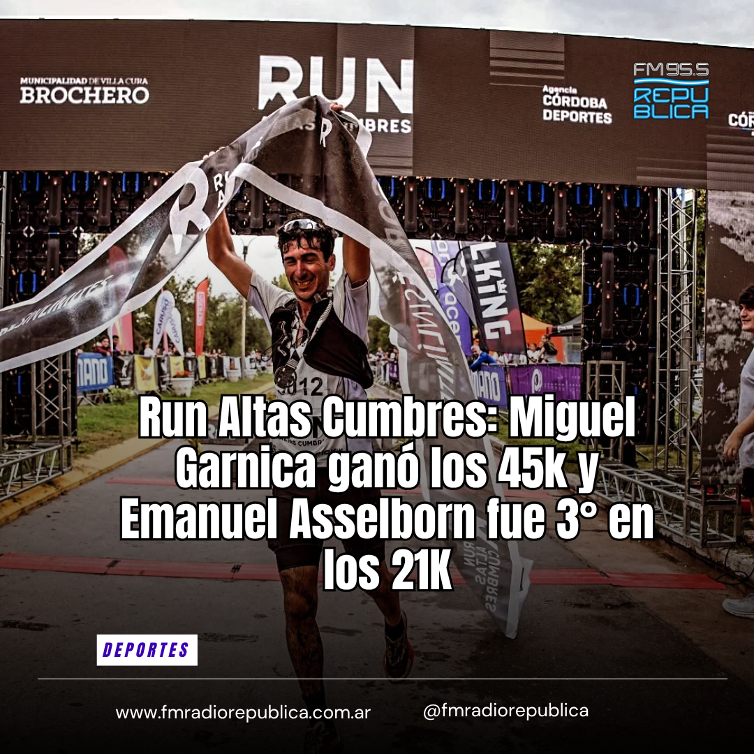 31/03/2026 - El pasado fin de semana se corrió el Run Altas Cumbres, la competencia se realizó en Villa Cura Brochero y senderos de la región. Miguel Garnica fue el ganador de los 45k, completó el recorrido en 4h. 37m.05s, seguido por Alejandro Castillo (4h.59m.13s) y Diego Cisneros (5h.03m.21s). Otro de los morterenses que se destacó en esta importante carrera de running de montaña fue Emanuel Asselborn, que terminó tercero en los 21k, con un tiempo de 1h. 43m.07s.