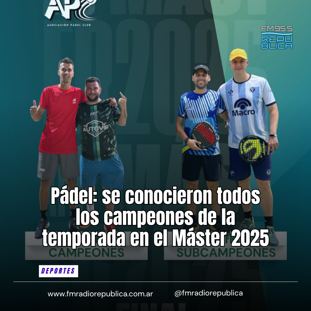 11/11/2025 - Durante el pasado fin de semana se realizó el Máster masculino y femenino de Pádel en todas sus categorías organizado por la Asociación Pádel Club (APC). Esta edición del Master se cerró, luego de la competencia deportiva, compartiendo un cálido agasajo junto a jugadores, público y equipo organizador, celebrando un año de esfuerzo, compromiso y pasión por el pádel. Este jueves comienza a disputarse el Interclubes.