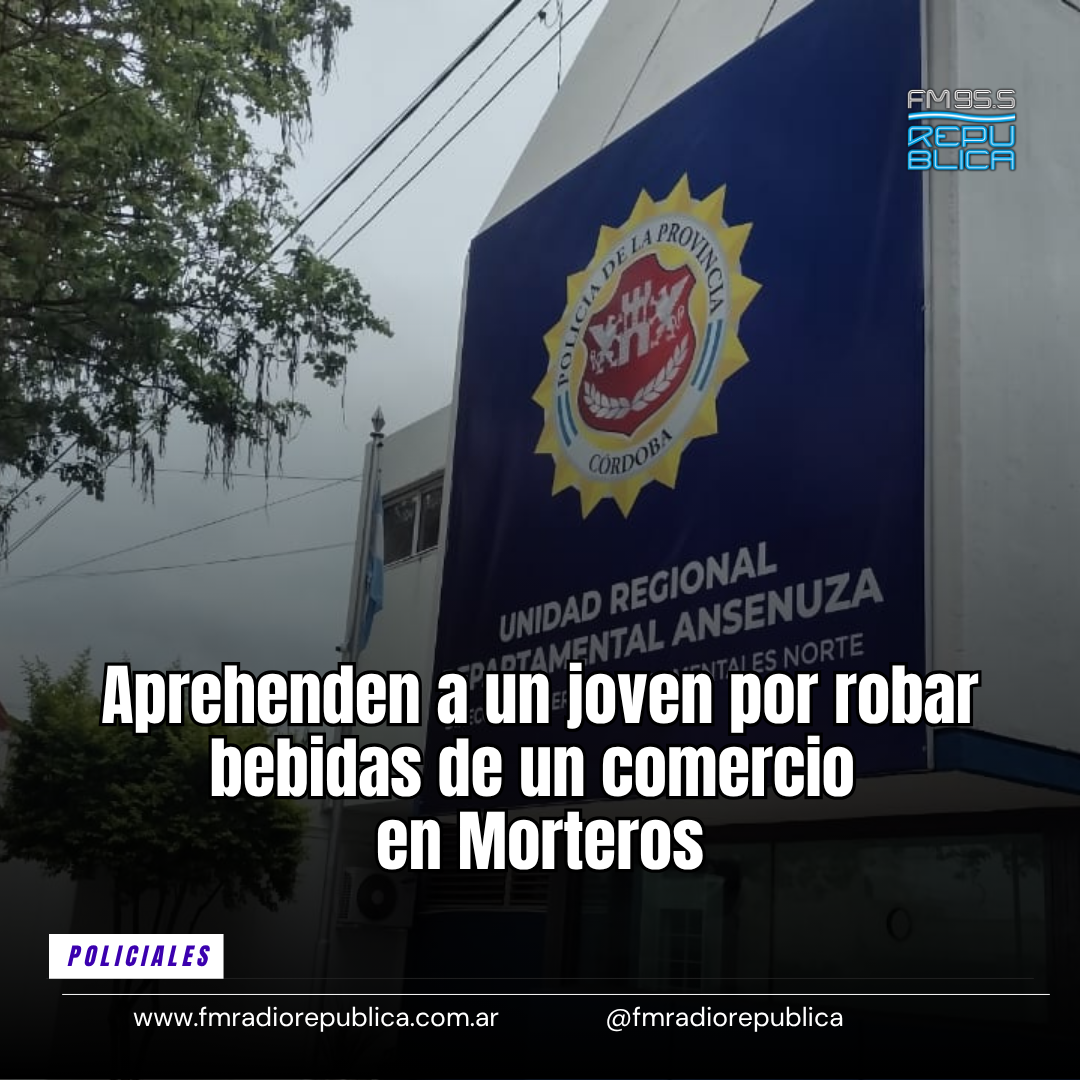 27/04/2026 - Un joven de 18 años fue aprehendido en Morteros tras protagonizar un hecho de robo en un comercio ubicado en la intersección de calles Chacabuco y Güemes. Según informaron fuentes policiales, el individuo había sustraído tres botellas de fernet, resultando damnificada una mujer de 63 años. Tras un rápido accionar, el personal logró interceptarlo y recuperar la totalidad de los elementos robados. El joven fue trasladado a la alcaldía de la comisaría local y quedó a disposición de la Fiscalía de Instrucción de Morteros.
