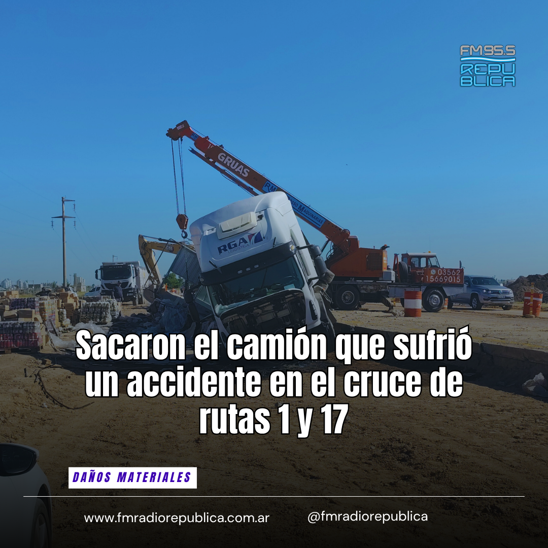 13/10/2025 - En la noche del domingo, un camión marca Iveco volcó en el sector de obras de la futura rotonda del cruce de rutas 1 y 17. El conductor no sufrió lesiones y se encontraba en buen estado de salud. Varios de los productos de la carga de alimentos (dulces y mermeladas) se pudieron rescatar sin daños. En la tarde del lunes, a las 16:30, una grúa pudo retirar el camión de la calzada.
