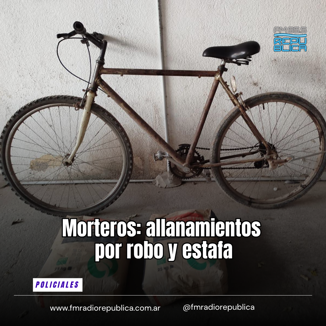 13/10/2025 - En la tarde del día viernes personal de investigaciones y personal de la Comisaría de Morteros, realizaron un allanamiento por un hecho de hurto, siendo damnificada una vecina de 34 años de edad. El procedimiento se llevó a cabo en un domicilio de calle Sáenz Peña al 1000, con resultado positivo, secuestrando dos bolsas de portland de 25 kg y una bicicleta tipo mountain bike. En la misma tarde, aproximadamente a las 19.00 hs, personal policial de Morteros llevó a cabo dos allanamientos en el marco de una investigación por estafa y robo.