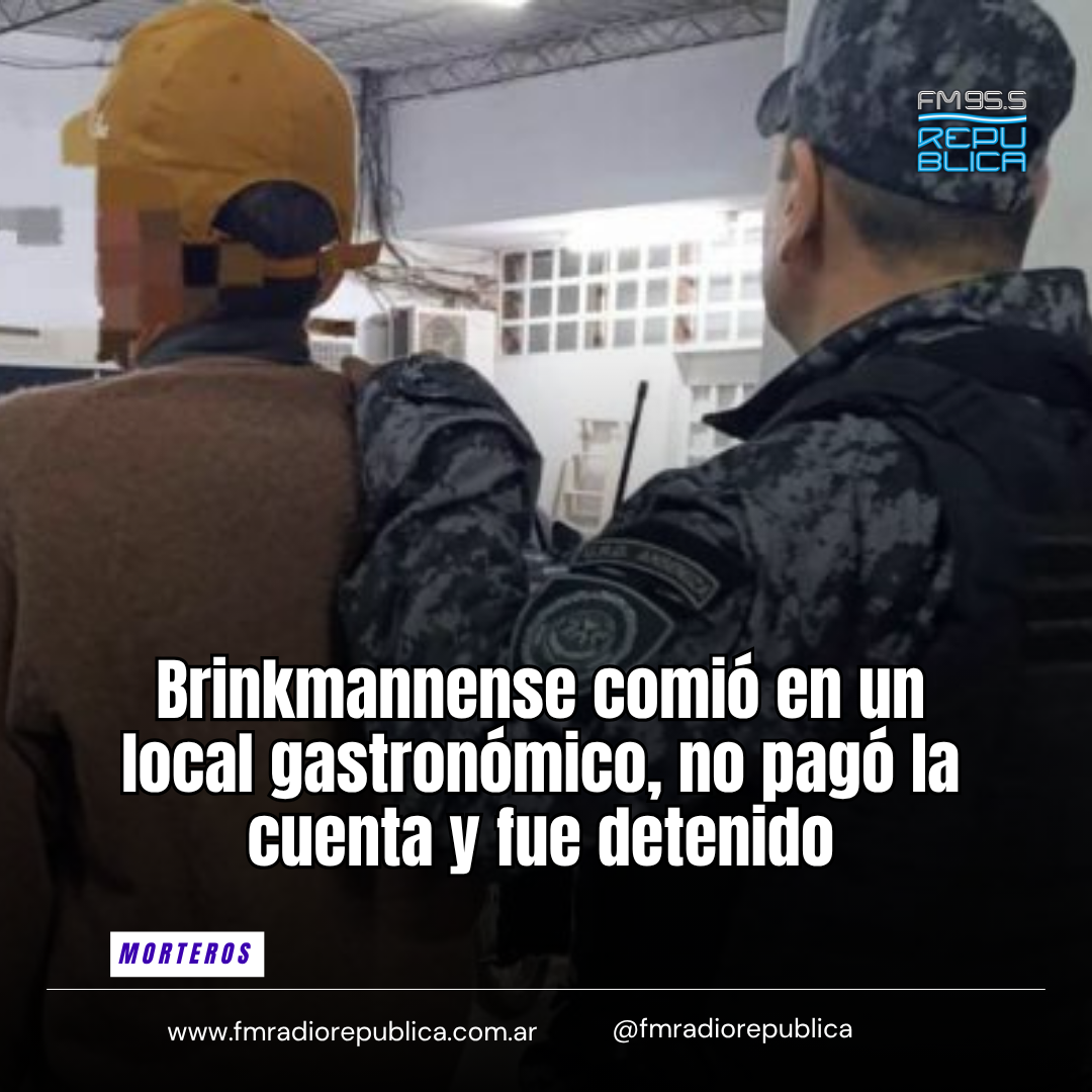 13/10/2025 - En horas de la madrugada del domingo, personal policial se constituyó en un local gastronómico ubicado en la intersección de Bv 25 de Mayo y Bv 9 de Julio, donde un cliente había consumido y no tenía para pagar la cuenta. El encargado del lugar, un hombre de 21 años explicó que un cliente realizó un pedido por la suma de $12.000 y al momento de abonar el sujeto manifestó no poseer dinero. La policía procedió a su aprehensión, siendo un hombre de 44 años, oriundo de Brinkmann.