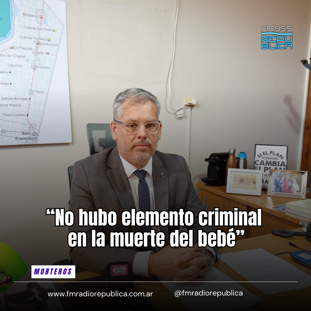 23/09/2025 - El fiscal de Instrucción de Morteros, Francisco Payges se refirió a la investigación iniciada en la jornada de ayer por la muerte de un bebe. “Puedo confirmar con relación al fallecimiento de un neonato ayer, y que padecía una patología previa, no obstante se activaron los protocolos que corresponden ante una muerte de etiología dudosa, que luego de autopsia que la causa de su fallecimiento estaba relacionada a dicha patología y que no hubo ningún tipo de indicador o elemento de tipo criminal”, dijo Payges.