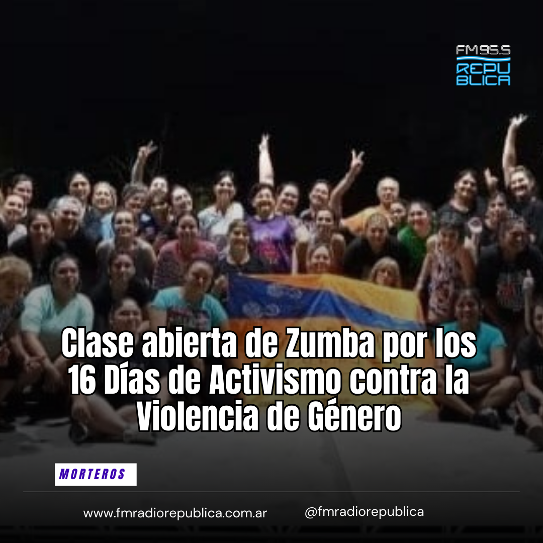 10/12/2025 - En el marco de los 16 Días de Activismo contra la Violencia de Género, la Municipalidad de Morteros, a través de la Dirección de Políticas Sociales y el Punto Mujer, invitan a participar de una Clase abierta de Zumba como cierre de las actividades desarrolladas durante esta campaña internacional. La actividad es gratuita se realizará hoy miércoles 10 de diciembre, a las 20 h, en el Lago Central. Se invita a asistir con una prenda de color naranja, color que simboliza la lucha contra la violencia hacia mujeres y diversidades.