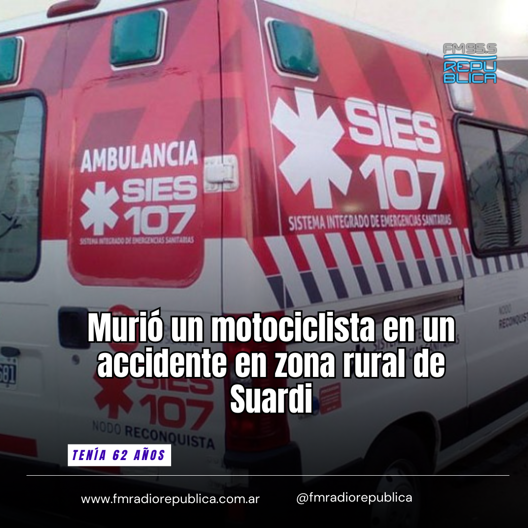 25/01/2026 - El trágico accidente se registró en las primeras horas de la tarde del sábado a unos 2 kms. al noroeste de la localidad y fue protagonizado por una moto y una camioneta ambos de Suardi. El siniestro ocurrió cuando impactaron una moto ocupada por Elio Ramallo de 62 años que transitaba de sur a norte, y una camioneta de una empresa de Suardi que circulaba de este a oeste. Como consecuencia del violento impacto, se constató el fallecimiento del motociclista.