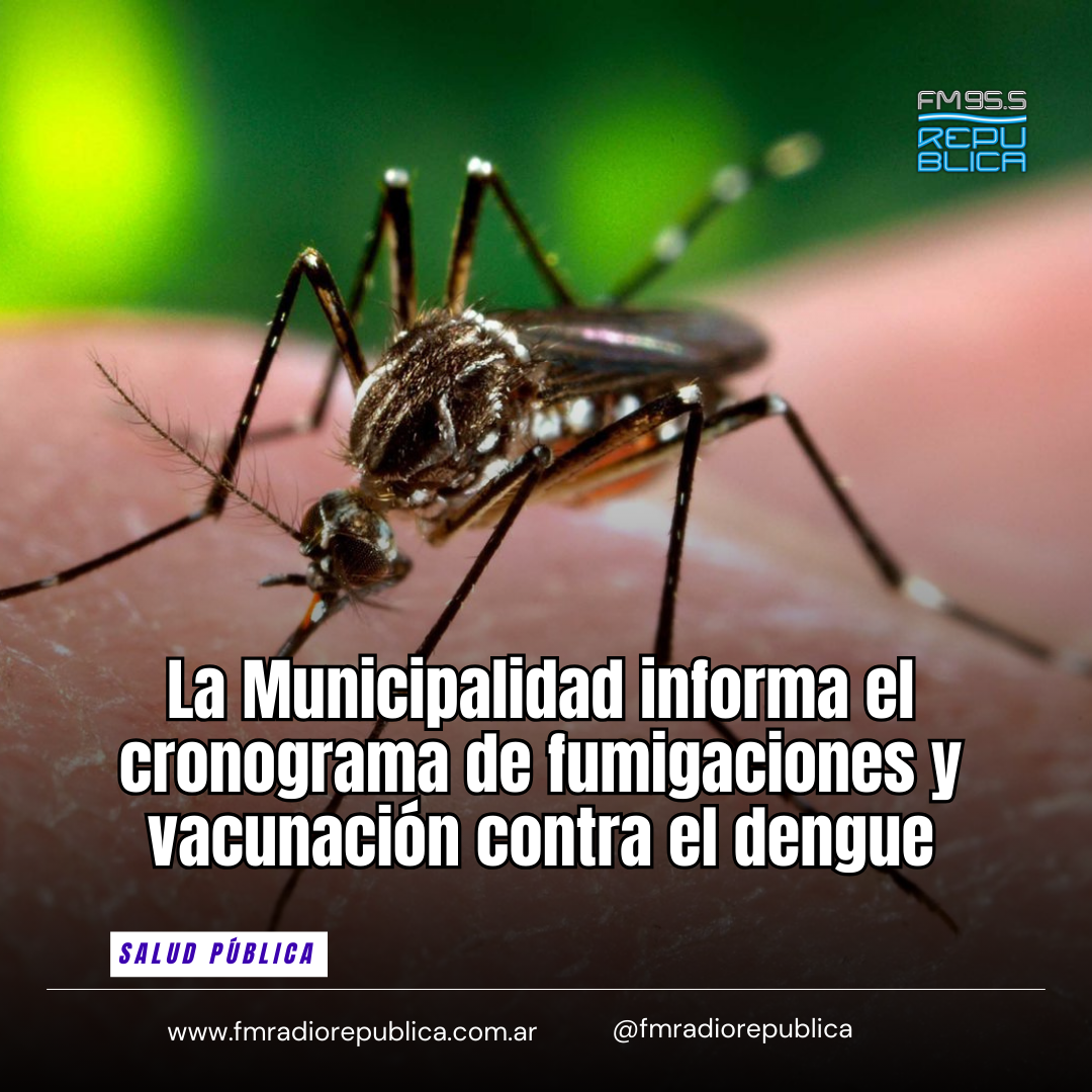 05/01/2026 - La Municipalidad de Morteros, a través de la Secretaría de Salud y la Dirección de Ambiente, informa que, en el marco de las acciones de prevención y control del dengue, se realizarán fumigaciones espaciales en distintos sectores de la ciudad. El cronograma previsto es el siguientes: este lunes 5: espacios verdes comunes y Parque Central, el miércoles 7: plazas, ciclovía y demás espacios verdes y el viernes 9: clubes y accesos a la ciudad.