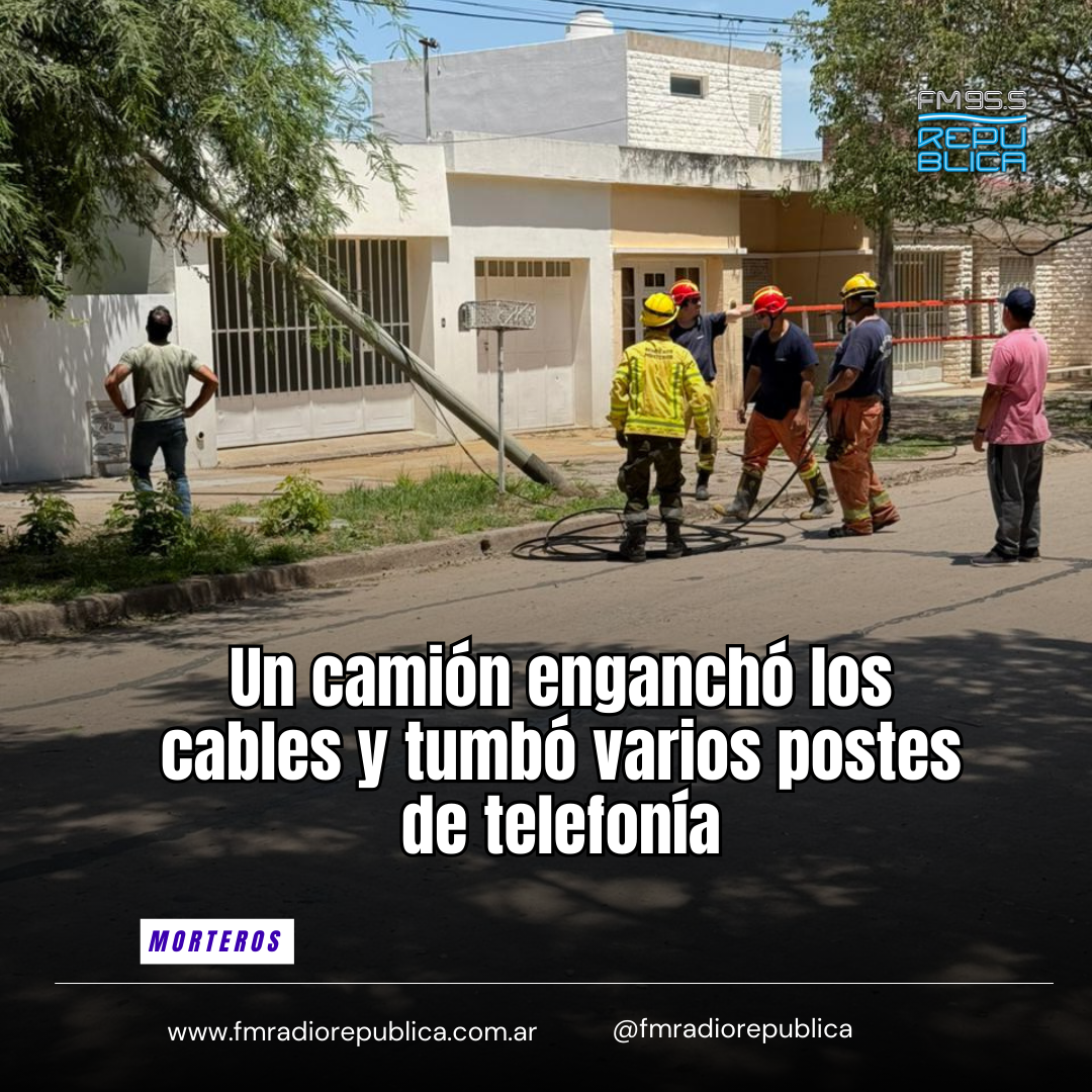 24/01/2026 - Este sábado en horas del mediodía, Bomberos Voluntarios reciben un llamado alertando que un camión enganchó los cables de telefonía y dejó varios postes inclinados. “Llegados al lugar nos encontramos con 6 poste de Telecom, inclinados representando riesgos al tránsito, con la ayuda del hidrovia de la Municipalidad de Morteros, se hizo un trabajo en conjunto para cortar los cables en altura y proceder, a cortar los postes y dejarlos al resguardo de los vehículos”.