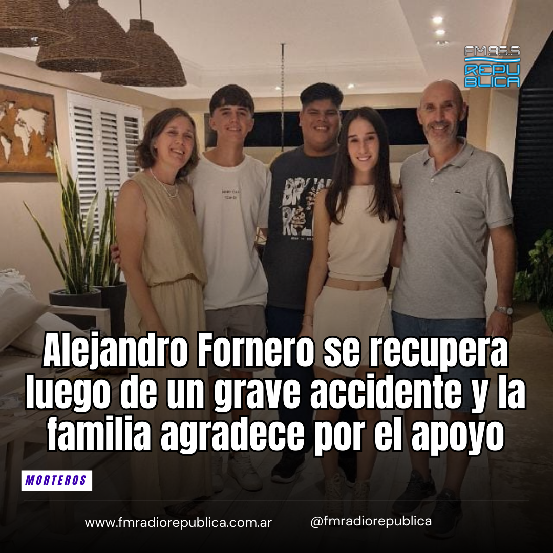 06/01/2026 - Alejandro Fornero sufrió un accidente de tránsito durante la noche del 1° de diciembre en Morteros. El joven circulaba en su motocicleta por el boulevard 25 de Mayo cuando colisionó contra una camioneta, hecho que motivó su inmediata asistencia y traslado al hospital local con un cuadro clínico muy delicado. Su estado fue seguido de cerca por toda la comunidad de Morteros, de Colonia Vignaud y Brinkmann porque Ale es alumnos del IAS. Luego de sortear momentos muy difíciles, su papá, Fernando habló con Radio República.