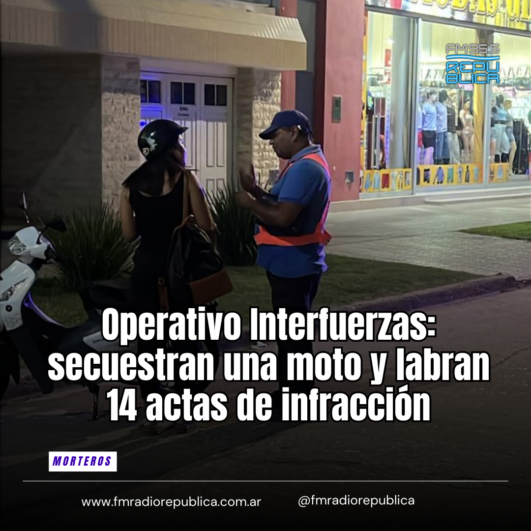 07/01/2026 - Durante la tarde- noche de este martes se llevó adelante un operativo interfuerzas del que participaron personal policial, de inspectoría y guardia loca Los controles vehiculares se iniciaron a las 19 hs y se prolongaron hasta las 21hs, y se ubicaron en las intersección de Alberdi y San Martin; Alberdi y Lavalle En total se controlaron 136 motocicletas y 12 automóviles, labrando un total de 14 actas de infracción por los siguientes motivos: - Conducir sin estar habilitado (5) - Conducir con licencia vencida (4) - Conducir sin chapa patente - Conducir sin edad reglamentaria (2) - Conducir sin poseer cedula de identificación de la motocicleta Además procedieron al resguardo de una motocicleta marca Honda, modelo Biz 105cc, dominio 436 EMX, color rojo , por conducir sin edad reglamentaria. Según se informó, se permitió al infractor comunicase con su padre, madre o tutor para que se acerque a retirar la moto pero nadie se llegó al lugar.