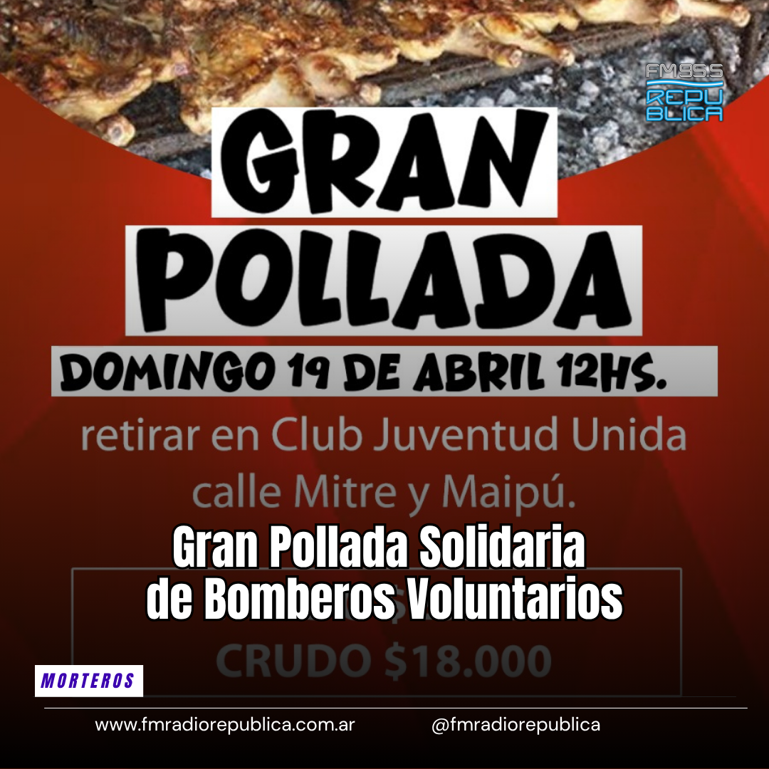 14/04/2026 - Bomberos Voluntarios de Morteros llevarán adelante una gran pollada solidaria el próximo domingo 19 de abril a las 12 horas, en el Club Juventud Unida, ubicado en la intersección de calles Mitre y Maipú. El valor del asado será de $20.000, mientras que la opción en crudo tendrá un costo de $18.000. El objetivo del evento es recaudar fondos destinados a la celebración de los 50 años de la institución.