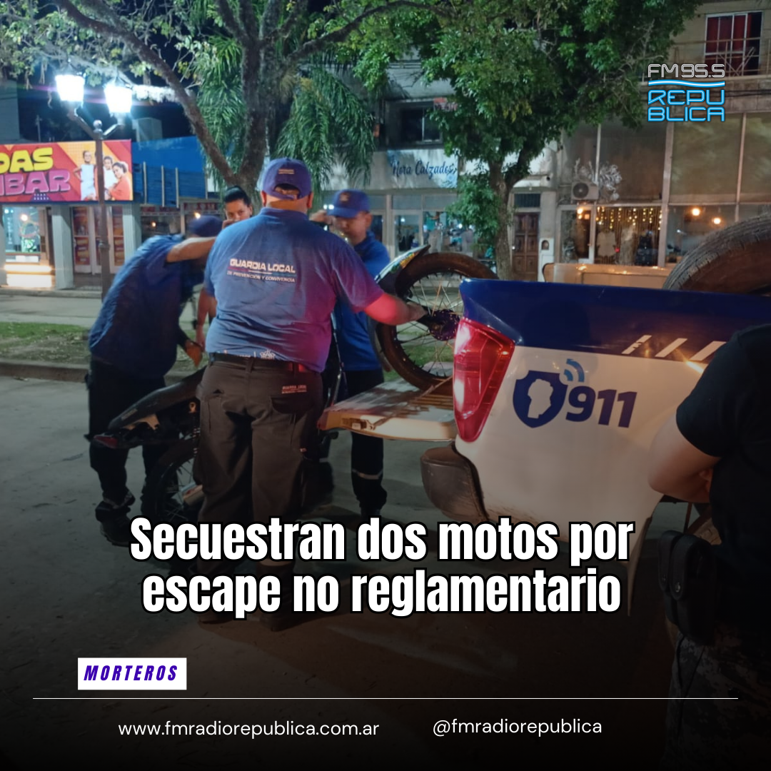 03/01/2026 - El primer secuestro se produjo en la noche del viernes (22:34hs). Personal de seguridad ciudadana procedió al resguardo de una motocicleta Honda, modelo XR 250cc "Tornado", dominio: A077FTT, color rojo y blanco, por contravención a la ley 9169 art 84/14 ord. 493, art, 17, Ord. 3146 art 1, por poseer caño de escape no reglamentario.