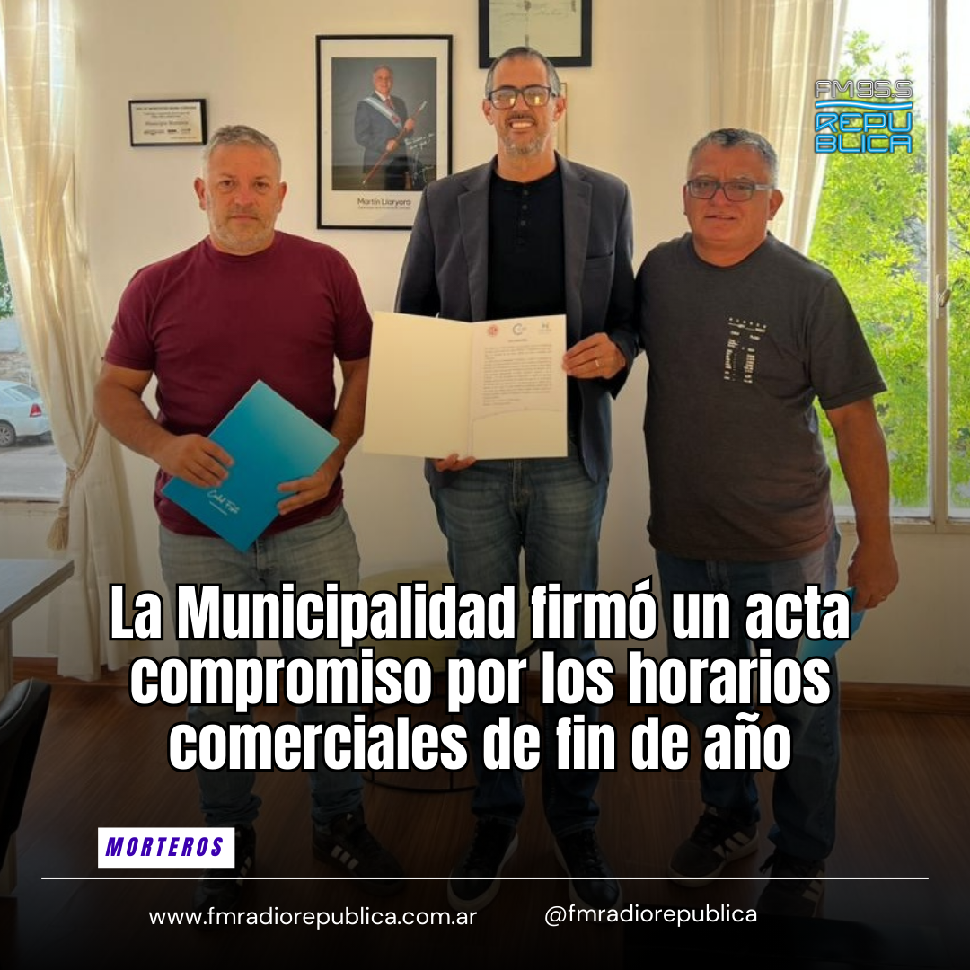 23/12/2025 - La Municipalidad de Morteros firmó un Acta Compromiso junto al Centro de Empleados de Comercio y el Centro Comercial, Industrial y de la Propiedad, con el objetivo de organizar los horarios comerciales durante las fiestas de fin de año y favorecer el descanso de los trabajadores del sector. En el marco de este compromiso, las partes acordaron realizar los esfuerzos necesarios para que los comercios de la ciudad los días 24 y 31 de diciembre abran sus puertas en el horario de 8 a 18 horas, permitiendo así que la mayor cantidad de trabajadores puedan retirarse con tiempo y compartir las celebraciones junto a sus familias.