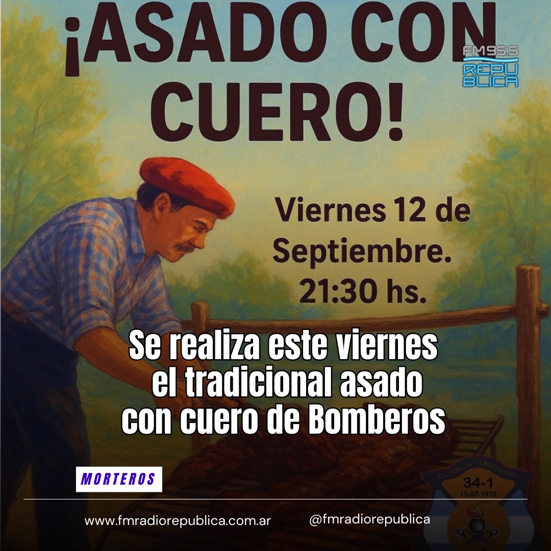 09/09/2025 - El próximo viernes se llevará a cabo el tradicional asado con cuero de bomberos voluntarios de Morteros. El evento será en la sede la institución a partir de las 21:30 hs. “Apuntamos a vender 250 tarjetas que es la capacidad máxima que tenemos en el cuartel para colocar sillas y tablones”, dijo Walter Racca Jefe del cuerpo activo aclarando que “no se venderá carne para llevar”. El jefe explicó que “lo recaudado será destinado a la reposición de indumentaria, tanto operativa como de representación institucional”.