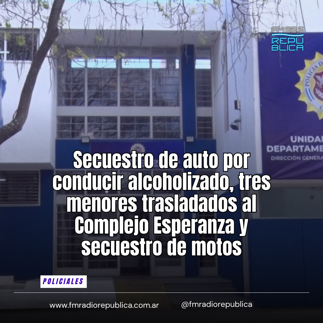 09/09/2025 - En un extenso parte policial con hechos del pasado fin de semana y el inicio de esta se destaca que el pasado domingo un masculino de 38 años, oriundo de Colonia Bossi, circulaba a alta velocidad y realizaba maniobras peligrosas, al realizarle la prueba de alcoholemia dio resultado positivo. Se secuestró el vehículo. Tres menores fueron detenidos por reiterados hechos en contra de propiedades y negocios de la ciudad. Fueron trasladados al Complejo Esperanza de la ciudad de Córdoba.