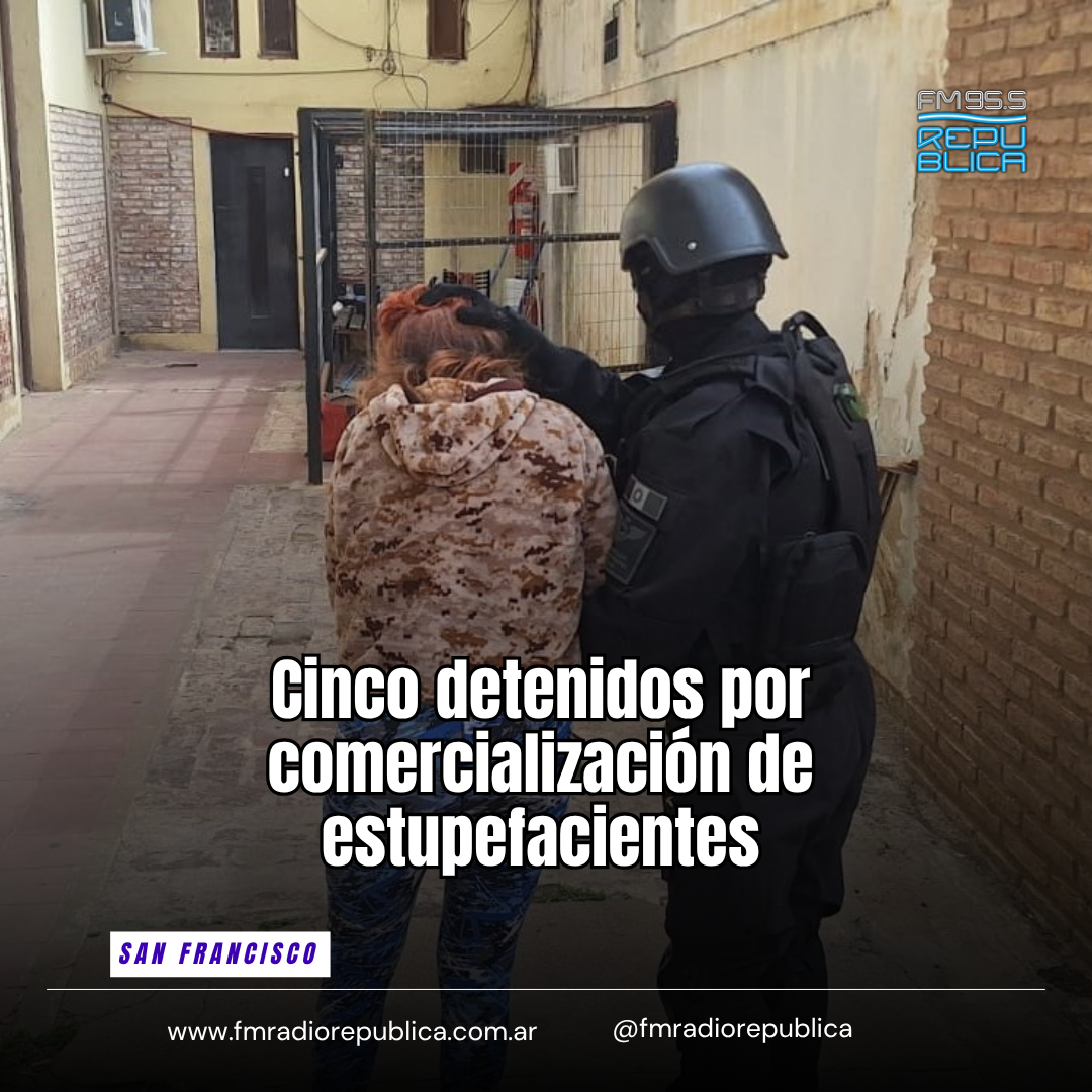 06/11/2025 - En un amplio operativo coordinado por el Ministerio Público Fiscal, efectivos de la Fuerza Policial Antinarcotráfico realizaron siete allanamientos que finalizaron con el secuestro de estupefacientes y la detención de cinco personas mayores de edad en la ciudad de San Francisco. El operativo se inició con las irrupciones por parte del Equipo de Acciones Tácticas, en siete viviendas distribuidas en los barrios Vélez Sarsfield, San Cayetano, Parque y La Milka de la ciudad cabecera del departamento San Justo. En el lugar, se realizaron las detenciones de dos hombres y tres mujeres, todos mayores de edad.