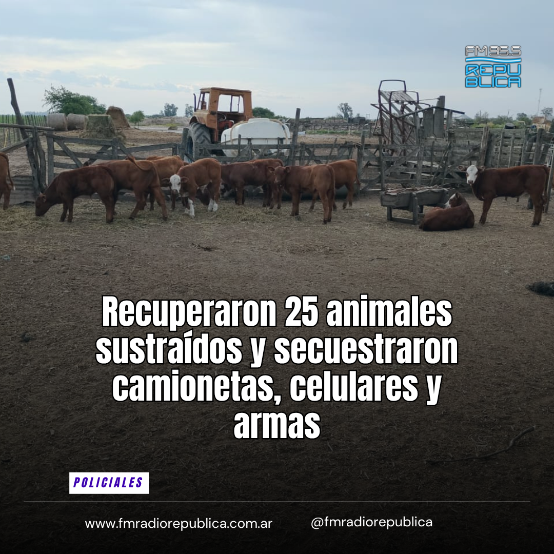 06/11/2025 - Este jueves, personal de Investigaciones de la Patrulla Rural Norte y Sur, tras varios días de investigación, bajo órdenes de la Fiscalía de Bell Ville a cargo de la Dra. Dolores Patti, realizaron distintos allanamientos en las localidades de La Varas, Las Varillas y Alicia, por un hecho de Abigeato donde resultó damnificado un productor del Norteste Cordobés, logrando el secuestro de dos camionetas, telefonía celular, un ternero sin vida, vestimenta y varias armas de fuego. En uno de los procedimientos se logró el recupero de 25 terneros raza Braford Colorado de 85 kg, que fueron sustraídos el 1° de noviembre en Paraje Rural de San Antonio de Litin, como así también se secuestraron una camioneta, zapatillas y un carro de dos ejes el mismo día.